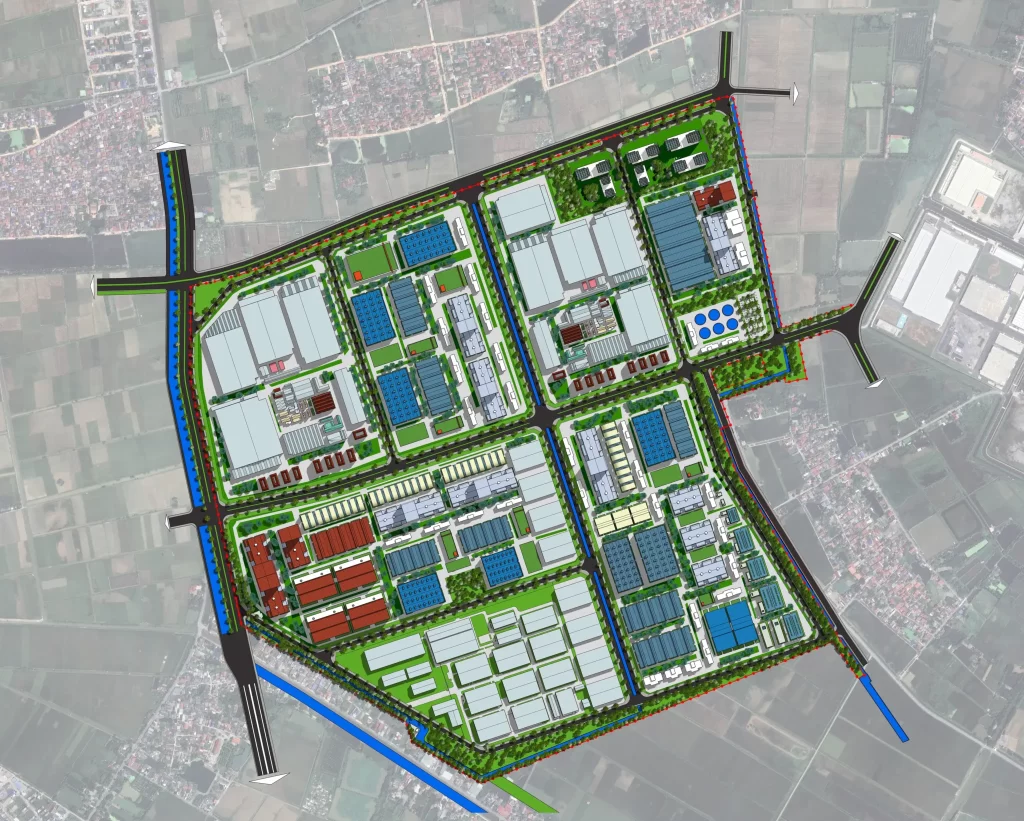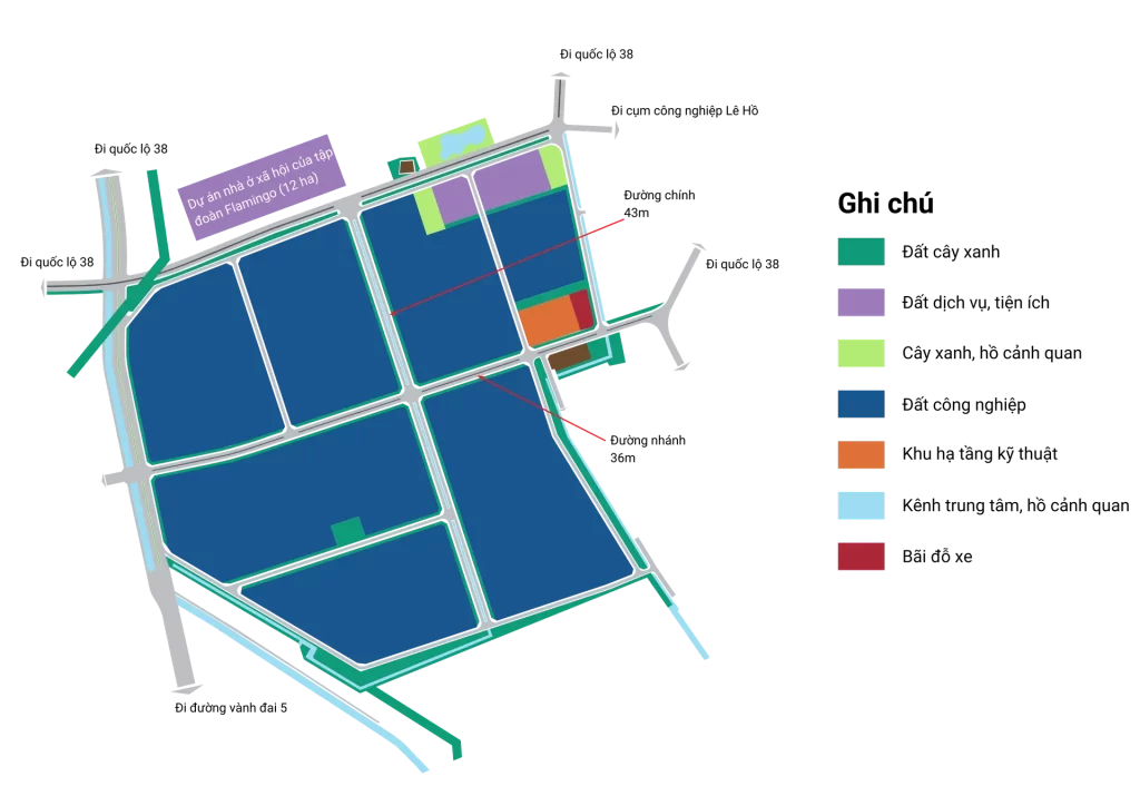 Diện tích đất công nghiệp chiếm 70% còn lại là đất quy hoạch cây xanh , dịch vụ tiện ích , khu hạ tầng kỹ thuật , kênh trung tâm , hồ cảnh quan và bãi đỗ xe.
